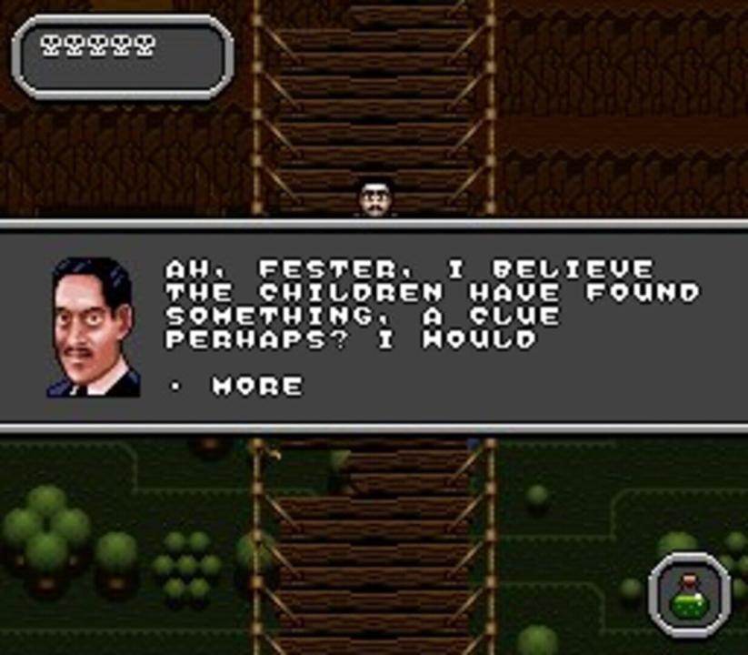 Baby Pubert, the most recent addition to the Addams Family, has been abducted by Debbie Jellinski, his former nanny. As Uncle Fester it is your job to rescue little Pubert. You must search the surrounding areas (forests, swamps, gardens and the like) of Addams mansion, while avoiding traps, solving puzzles and killing monsters. You'll face such hellish creatures as vultures, gargoyles, bats, ghosts and ghouls. During your mission, you'll run into Gomez, Morticia, Lurch and other members of the Addams Family, who are on the grounds to lend advice and provide items. These items include a box of seeds for producing enemy-attacking mini bushes, black beetle cookies which give Fester a dose of ill-health (this is a good thing), stone marbles for turning attackers into rock, a bowling ball for hitting enemies and breaking through walls and a battery, which powers up Fester's standard Zzap attack. Within the seven levels of play, there are tons of other creatures to zap and items to find.
