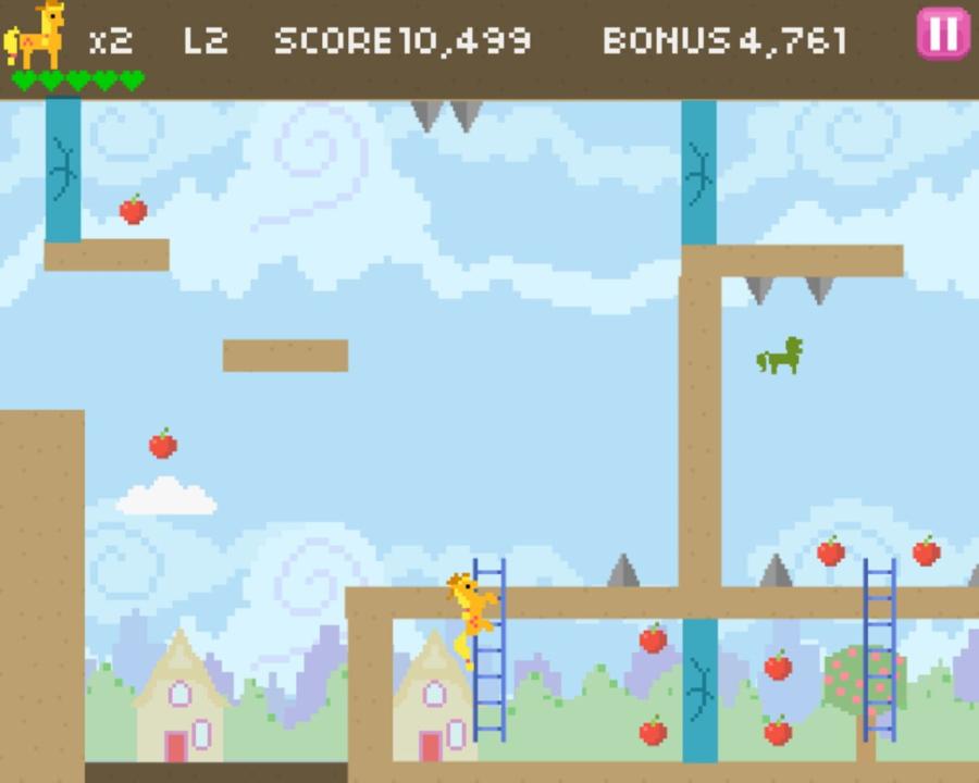 Adventure Ponies! is a platform game with retro-style graphics, based on the TV show My Little Pony: Friendship is Magic. It was originally released on the website of The Hub, the TV channel broadcasting the show. The player takes control of one of the show's pony protagonists in order to find the "Elements of Harmony" and defeat villains. The game consists of six levels, where the player must jump across platforms, avoid spikes and pitfalls, and collect apples for bonus score. To finish a level, the player must find the "Element of Harmony"; after each level follows a boss fight with one of the villains from the show. The player has a limited amount of health and lives, but life and health bonuses can be found. There are six pony characters in total to choose from. Initially only one character is available, and a new pony is unlocked when the player finishes all six levels. The ponies have different abilities - e.g. Twilight Sparkle can shoot laser beams and use teleport pads, while Applejack can climb ladders and kick. The levels remain the same for every character, though with slight changes to account for their varying skills.