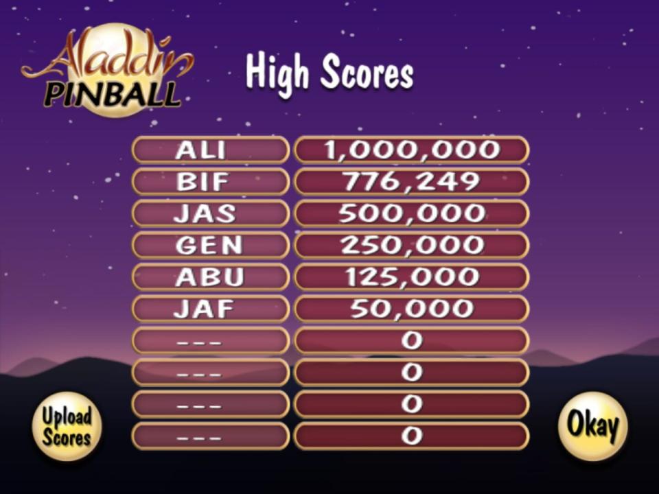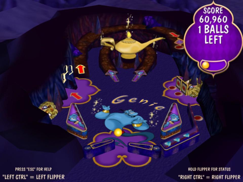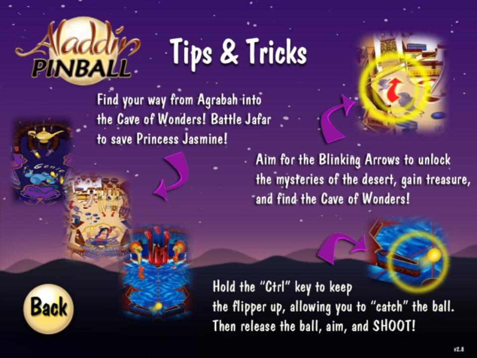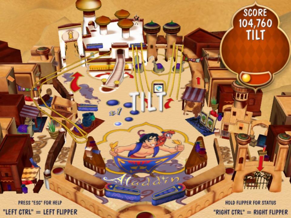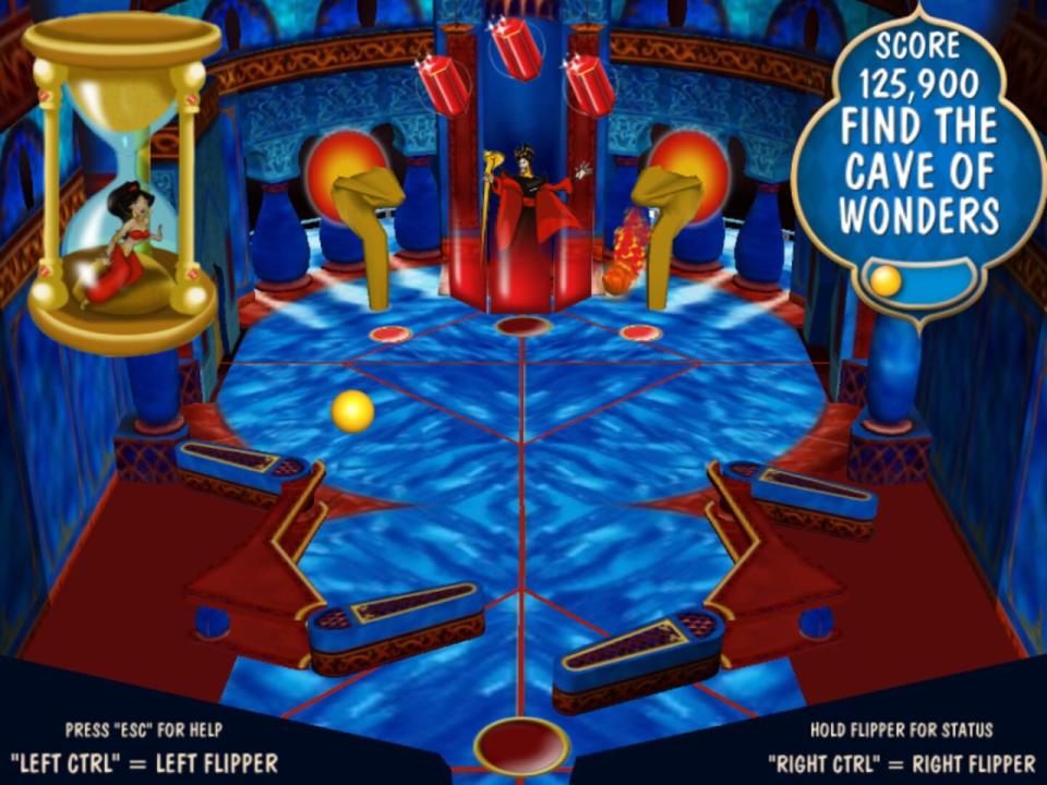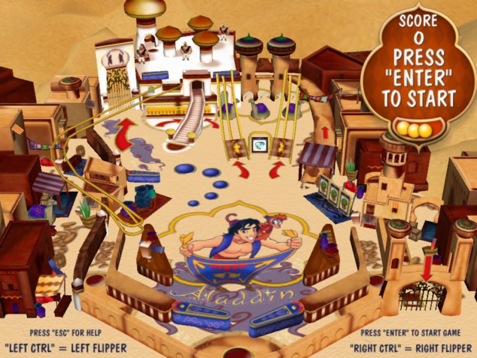Aladdin Pinball is a high-speed game set in the magical land of Agrabah. Players join their favorite characters from the film, Aladdin and Princess Jasmine, for pinball fun on three exciting boards. Players can experience the excitement of the city marketplace as they knock down scimitars or hit pots and watermelons. They can also enter the Cave of Wonders and aim for the magic lamp to unlock the multi-ball feature for bonus points, or move into the Royal Palace to knock down Jafar and save Princess Jasmine.