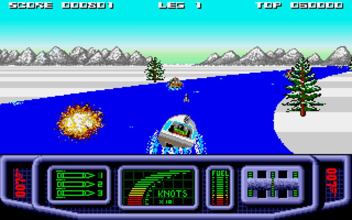 James Bond: Live And Let Die is a racing video game loosely based on the 1973 James Bond film of the same name where James Bond navigates the stages in a modified speedboat. The game was released by Domark for the Amiga, Atari ST, Amstrad CPC, Commodore 64, MS-DOS, and ZX Spectrum in 1988. Developers Elite Systems International Ltd began writing the game without knowing it would ultimately become a James Bond title. The game was swiftly branded with the usual 007 trappings and titled Live And Let Die as publishers Domark spotted the obvious connection with the film's speedboat chase. Elite also released the game Aquablast (the original title) to the market without any Bond branding.