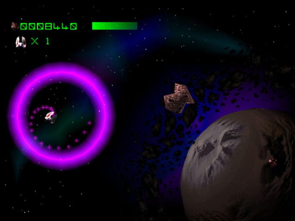 Unlike Activision's earlier remake of an Atari arcade classic, Battlezone, this one stays close to its namesake. Take the original, Atari coin-op game Asteroids, add in the features of the Atari 2600 cartridge, then give it 3-D graphics and a bunch of power-ups, and you've got Activision's Asteroids remake. There are three types of ships to choose from, each with different strengths and weaknesses. There are also three skill levels. If you beat the game at Expert or higher, you gain access to a fourth type of ship. All ships features the standard laser, shield, flip (instantly flips your ship 180 degrees), and hyperspace. There are also limited power-ups you can pick up such as GunSat, Mines, Homing Missiles, Plasma Drill, and Trigger Bombs. The game supports either one or two players. In two player mode, the object is to simply outscore your opponent in a random zone and level. You cannot directly kill your opponent by shooting him, but there are other ways.... Lastly, if you shoot the classic-style asteroid in level 15 of the first zone, you'll find the option of "Classic Asteroids" now appearing on the main menu.