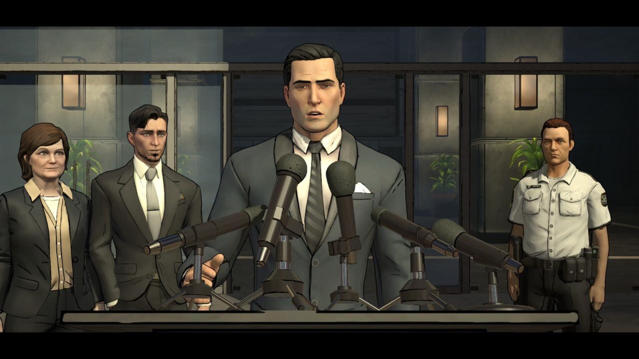 Continuing on the choices from previous two episodes, New World Order puts a spotlight on Bruce Wayne after his father's misdeeds were broadcast live on TV. The board of directors of Wayne Corporation voted to remove him as acting CEO and temporarily place none other than Oswald Cobblepot, who nobody knows is the actual Penguin, a terrorist behind the attack on the TV station, as acting CEO. Oswald seems to enjoy his new role and doesn't let Bruce leave the office gracefully.