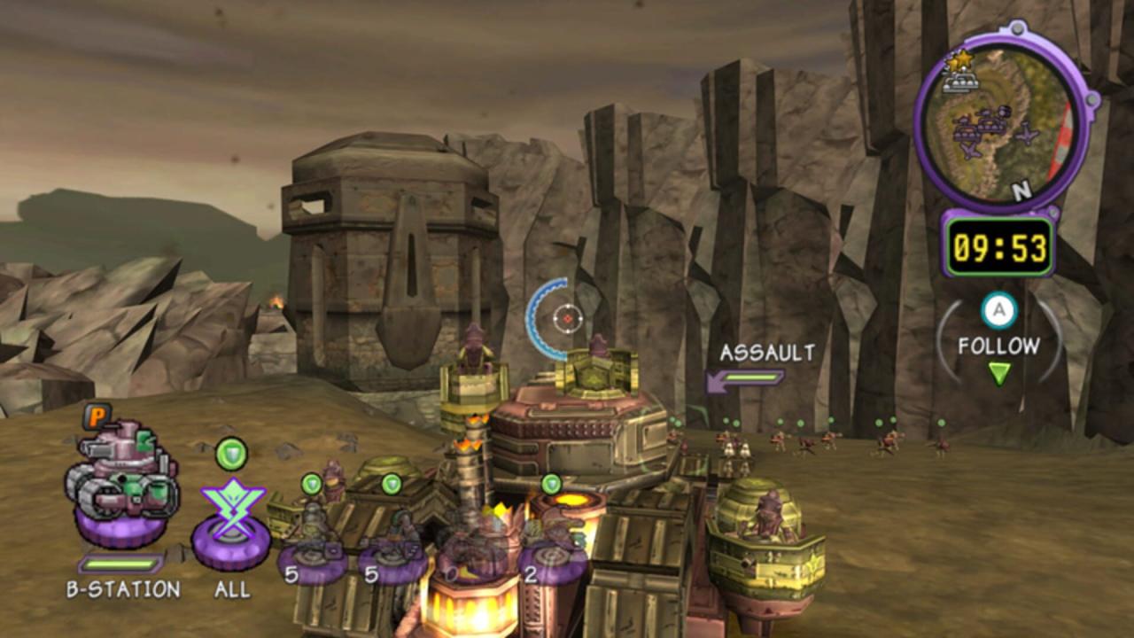 This sequel to Battalion Wars plays much like its predecessor, blending real-time strategy with third-person shooting. The game's plot traces decades of war among six factions (Solar Empire, Western Frontier, Anglo Isles, Iron Legion, Tundran Territories, Xylvania), and unfolds through contemporary missions that advance the conflict and flashback missions that reveal its history. Players control a soldier or a land, sea, or air vehicle to engage in combat directly and to command other units. The Wii Remote is used to target and fire, but selecting and ordering units is performed through conventional button presses. The Wii Nunchuk's thumbstick controls player movement, and evasive maneuvers are handled through gestures. In the single-player campaign mode, the player assumes control of the various factions at different points in the conflict's history. The game also features three online multiplayer modes. Skirmish mode is a timed two-player match to score more points than the other player by destroying opposing units. Assault mode is a timed two-player match in which one player attempts to destroy the other player's resources and fortifications while the other defends. Co-Op mode is an untimed two-player match in which both players work together to complete special online missions that are not part of the single-player campaign. Offline local multiplayer is not supported.