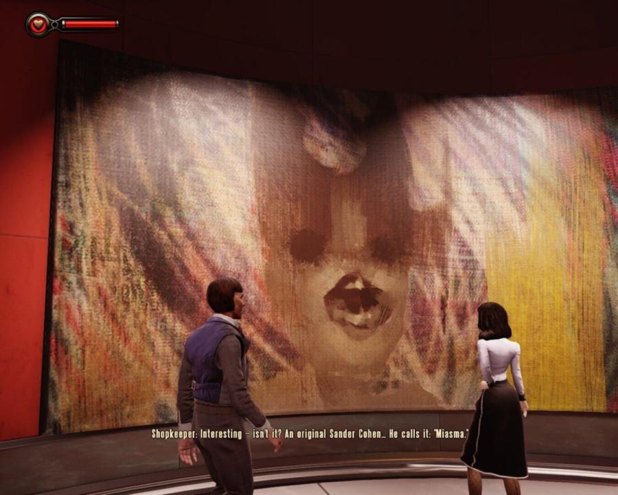 In the city of Rapture, Booker DeWitt is a well known private investigator, handling his clients' dirty work, when not drinking and gambling. On the eve of 1959, a mysterious woman by the name of Elizabeth asks him to investigate the disappearance of a young girl named Sally. Elizabeth's intentions are vague and she is unwilling to reveal any vital information, saying only that Sally is alive and elite artist Sander Cohen may have information regarding her whereabouts. The duo journey to Cohen's at High Street, but are denied entrance to the club. Needing the masks specifically crafted for the club's exclusive party guests, Booker and Elizabeth search the nearby shops. With Elizabeth distracting the shopkeepers, Booker is able to retrieve the required mask and the two are welcomed into Cohen's party.