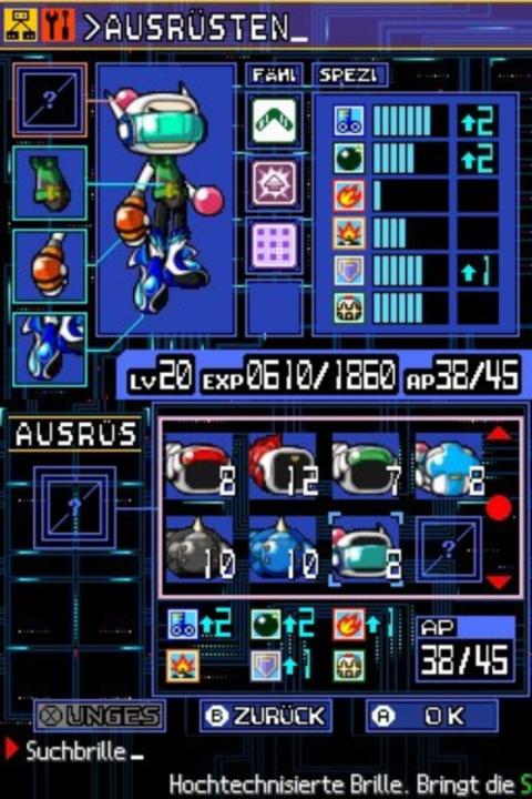 In Bomberman 2 DS, players can customize their own Bomberman using an assortment of different body parts with various statistical advantages that are unlocked as you progress through the main story mode in which you solve puzzles and defeat enemies. In multiplayer, up to four players may battle each other using their own customized Bomberman. Bomberman 2 also features the classic arcade style multiplayer mode from Bomberman DS and Bomberman Story DS for up to eight players in LAN and a maximum of four players over Wi-Fi.