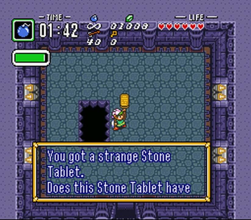 Ancient Stone Tablets was a Japan-Only release for the Legend of Zelda: A Link to the Past. It was an add on made for Satellaview, a system that takes radio broadcasts and processes them into games live. The game came in four weekly broadcasts and made new additions to the original, such as weather, many new dungeons, and a new story. The game was much like a Second Quest or Master Quest of A Link to the Past, sharing a very similar overworld with slight changes and entirely new dungeons. Unlike a Second Quest however, it has an entirely new story. Various actions earned the player points, and these points could later be traded in to Nintendo for different prizes. Ancient Stone Tablets is different from most other Zelda games as the game's central heroes are actually the avatars of the player's ID for the BS-X Broadcasting System (Super Famicon), drawn into Hyrule, which is also true for BS The Legend of Zelda. The difference being that this time the player does not take the place of Link, but takes part in a new tale set after the events of A Link to the Past. The male character wears a green tunic (though others are later available) and a backwards baseball cap. The female character has long red hair and is otherwise almost exactly the same as the male.