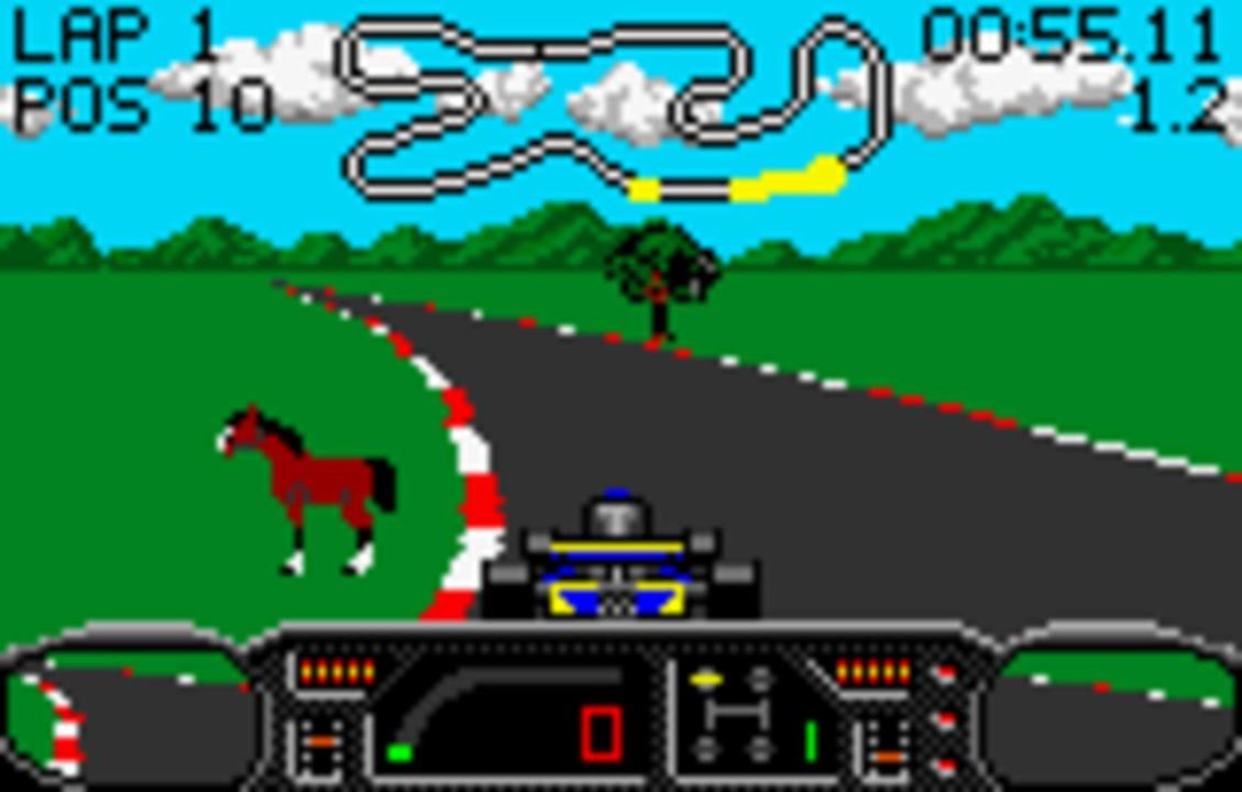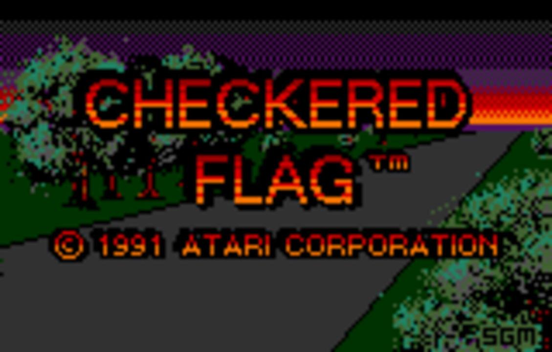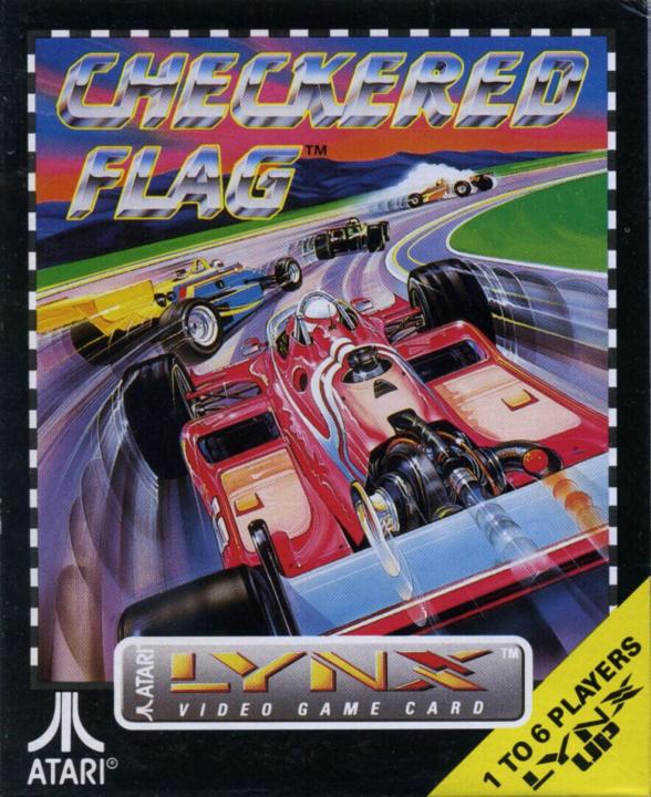 Checkered Flag for the Lynx is a racing game employing open-wheel racing cars (either Formula 1 or Indy-style depending on whether the box or the instructions are believed). The game features 18 tracks located in the American countryside or cities. Game modes include Practice, Single Heat and a 8-race Tournament. The start position can be set randomly or determined in a qualifying lap and the length of a race can be set between 1 and 50 laps. Also customizable are color of the car and the gender of the driver, both having only cosmetic effect. Gameplay is Pole Position style, with the own car seen from behind, a perspective view of the track, and cars and roadside obstacles displayed as sprites. A graphical representation of the track, lap times, speed meter and rear view mirrors are always in display. One button accelerates, another brakes. Left and right on the joypad steers while up and down shifts gears if manual transmission (either 4 or 7 gears) has been selected beforehand. Crashing into other cars sends the own car into a spin while hitting roadside obstacles (trees, bushes, rocks or animals) reduces speed to zero. The game can be played by up to six players via a ComLynx connection. If fewer players race, remaining slots can be filled by AI-controlled drivers for a maximum of 10 cars per race.