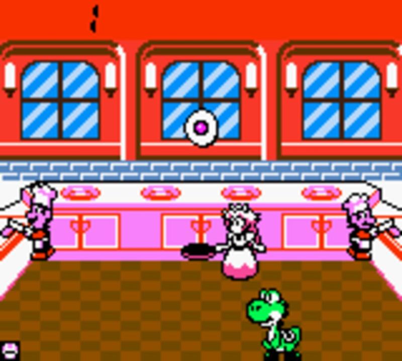 Peach must flip cooking items thrown into the air by the Mario Bros. with a pan and feed them to Yoshi.