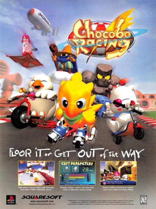 Chocobo Racing borrows themes and elements from Final Fantasy I to VIII. The Story Mode is narrated by Cid and includes nine chapters in a pop-up book fashion with FMVs. To progress, the player needs to defeat the chapter's respective challenger. Before each chapter begins, the player is given the option of viewing the story or skipping to the race except when playing the Story Mode for the first time. Characters The cast of Chocobo Racing is drawn from recurring creatures and characters from the Chocobo's Dungeon and Final Fantasy series. Eight characters -- Chocobo, Mog, Golem, Goblin, Black Magician, White Mage, Chubby Chocobo, and Behemoth—are immediately available, and additional, secret characters such as Cactuar, Bahamut, Cloud, Aya, and Squall may be unlocked after completing Story Mode.[5] Story Chapter one, titled "Gadgets a go-go", begins with the inventor Cid presenting Chocobo with a pair of "Jet-Blades" and offers Chocobo a chance to take a test-run with them on the racetrack behind his lab.[13] After the race, Mog the Moogle drops in and asks Cid about the progress of the racing machine he'd commissioned.[14] Cid promises to bring the machine by tomorrow, but later confides to Chocobo he'd forgotten it.[15] The next day, after presenting the doubtful Mog with his scooter,[16] Chocobo and Mog race. After Chocobo wins, Mog confronts Cid over his vehicle's poor performance, but Cid replies that Chocobo won because of the differences in their abilities (i.e., Chocobo's "Dash").[17] He explains that the secret of Chocobo's "Dash" ability is the Blue Crystal on his leg-ring.[18] Mog mulls over his inferior "Flap" ability and decides he wants a Blue Crystal as well, so Cid recommends that the two go on an adventure to find out the secret of the Blue Crystal.[19] The two head out to discover the secret behind the Blue Crystal, meeting (and racing) many along the way. When they reach Mysidia, the village of mages, a White Mage there notices that all the companions have Magicite, which the companions had previously referred to as "Blue Crystals". The companions want to know the legend behind the Magicite shards; the White Mage agrees to tell them on the condition that they race her in the Floating Gardens, with the story as the winner's prize. Upon winning, she tells them of the legend: "There are Magicite Shards scattered all over the world. It used to be one large Magicite Crystal...But people kept fighting each other over it. So the founder of Mysidia, the great magician Ming-Wu, broke the Crystal into eight pieces. He then scattered the shards to the four winds. He did so to assure later restoration of the Magicite Crystal...when all eight pieces are brought together again".[20]
