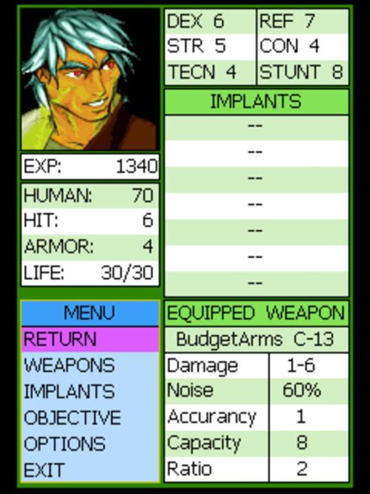 Cyberpunk: The Arasaka's Plot is a mobile game based on Mike Pondsmith's pen and paper RPG Cyberpunk. The game is a platformer similar to Flashback. The player can walk and run left and right, jump, crouch and climb ledges up and down. When entering combat the player uses a gun at long range or a melee attack at short range. Once enemies have been killed the player can take their armor and other items they might carry. Items that can be found include implants and new weapons. After taking damage, medic kits can be used to restore health. The player can hack various computer terminals he comes across. By doing so it's possible to get access to weapon and stat upgrades and to unlock doors. The player might also come across links to the game's website where more of its back story is revealed. Hacking involves playing a mini game that is similar to QIX. The game has some minor RPG elements although the player's stats increase automatically as he progresses through the game. There are also implants that can be used to give the player an advantage through special abilities.