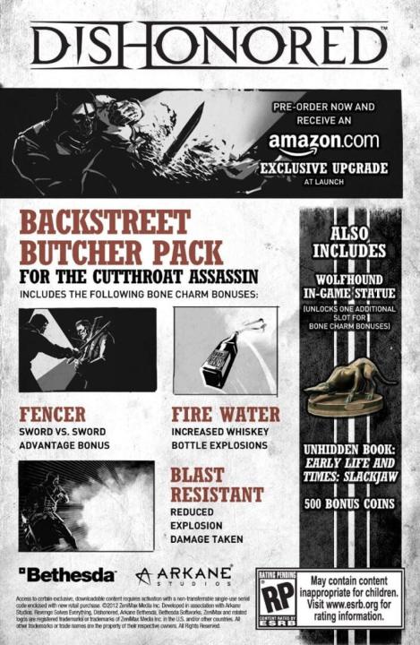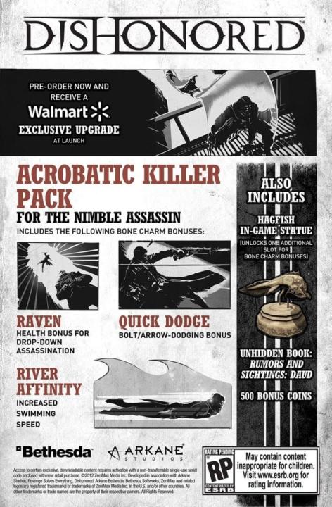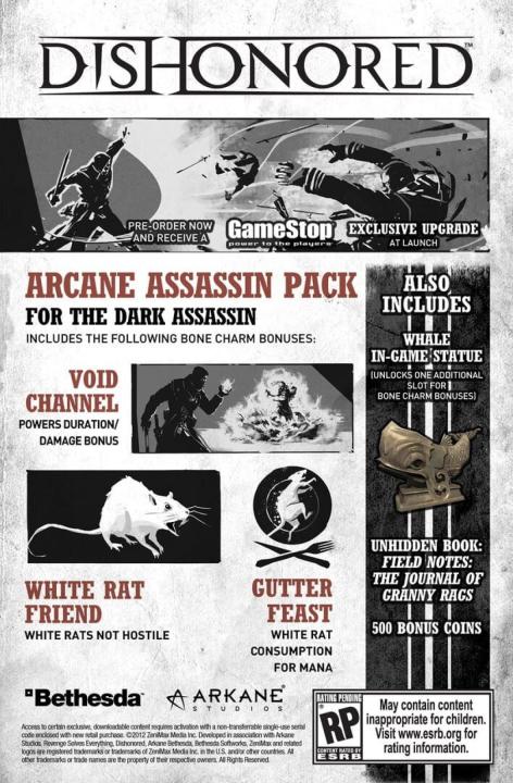The gifts of the Outsider are bestowed unto those who walk the Void. With the Void Walker’s Arsenal add-on pack, gain immediate access to four content bundles previously available only through pre-ordering Dishonored. The Acrobatic Killer Pack, Arcane Assassin Pack, Backstreet Butcher Pack and Shadow Rat Pack offer unique character bonuses, additional bone charm slots, unhidden books and bonus coins that will aid you in your pursuit of revenge. Found in the Hound Pits Pub, use these items to enhance your playthrough of Corvo’s main campaign in the original game.