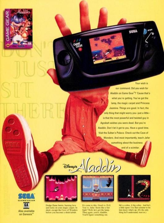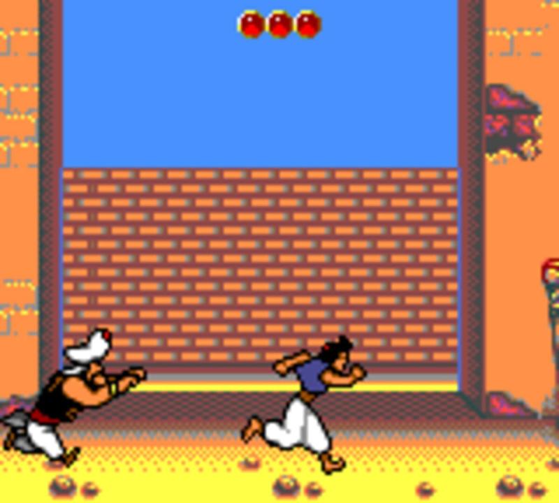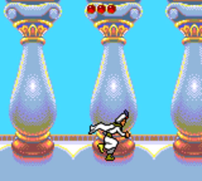 This version of Disney's Aladdin is a completely different game than either the SNES or Genesis versions, and was only released for SEGA's 8-bit systems, Master System & Game Gear. It has a classic-era Prince of Persia kind of gameplay. Like the other versions, it is a side-scrolling action game. The player controls Aladdin, making his way through a variety of locations, including the streets of Agrabah, the Cave of Wonders, the Sultan's palace and more. Gameplay takes several different forms: some levels are chases, where Aladdin runs automatically, but must be made to jump over chasms or rolling rocks and barrels, evade falling objects and avoid getting caught by a guard. Other levels are platforming affairs: Aladdin must run, jump and climb, find keys or switches to open doors while searching for the exit. Rocks can be collected and be thrown to dispatch enemies or hit buttons otherwise out of reach. Finally, there are also several magic carpet rides in the game, in which the level scrolls automatically and the player must make sure to avoid any obstacles in the way.