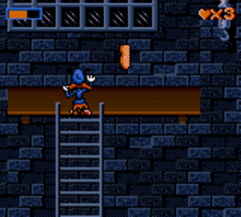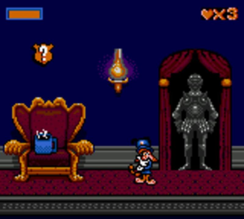 In this platform game, the player controls Bonkers through several levels where he must find 7 pickle clues. By pressing the pause button, a compass is shown, with the number of remaining clues and the direction of the next one. Bonkers can run (by holding button 1), jump (button 2) , duck and slide (by running and pressing the opposite direction on the d-pad). Bonkers will find several items to restore his health (like cups of coffee, donuts, slices of pizza and badges) as well as some bonus items. He'll also find some of his friends, like Marylin, who'll show him the way to bonus levels, where he must find pieces of the Toon Toaster. In these bonus levels, Bonkers will ride a mine cart in a rail course, trying to collect items.