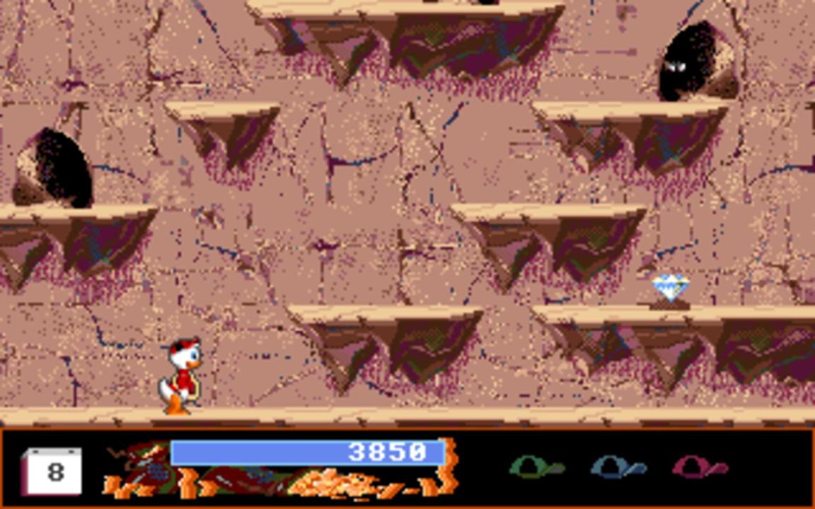 The game starts as Flintheart Glomgold walks into Scrooge McDuck's office and challenges him to see who is the richest duck in the world.[1] Assuming the role of Scrooge, the player then gets 30 days to collect treasures from all around the world. Scrooge is assisted by his grandnephews Huey, Dewey and Louie and pilot Launchpad McQuack. Flying to different destinations is one of the many different sequences in the game. Many of these destinations are fictitious or imaginative, names often being puns on real locations, and some were featured in episodes of the show. Some exist in the real world, such as the Carlsbad Caverns. In flying sequences to reach the destination, the Beagle Boys try to hinder the player by methods such as dropping pianos. If the plane crashes, the player will lose money as well a couple of days while Gyro Gearloose repairs the plane. Alternatively the player may also find the rare mineral Bombastium, which Gyro can use to create a matter transfer unit. This eliminates the need to travel by plane, and therefore the risk of crashing and losing time and money; the downside is that the matter transfer unit malfunctions sometimes and sends the player to the wrong destination. Upon reaching a destination, the player has to play through a certain scenario to reach the treasure. The four different scenarios are divided equally among the many destinations, and are typical for the environment. Some of these scenarios, namely the mountain and the jungle, are platform-based levels where the player plays as Huey (later Dewey and Louie if the player fails the first attempt). Other level types include the cave, which is a labyrinth the player must navigate through, and the wildlife reservation which features Webby Vanderquack taking pictures of animals. The pictures, especially ones with rare animals such as pink elephants, bring rewards for the player similar to the treasure chest in the other levels. Photography levels are rather easy to play, seeing as there are no real obstacles.