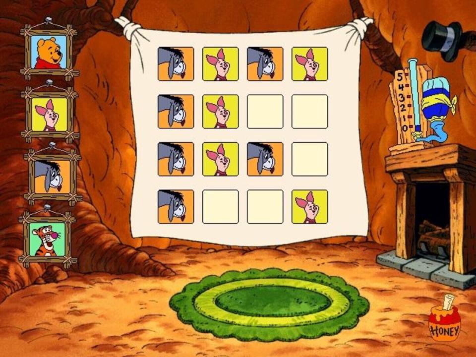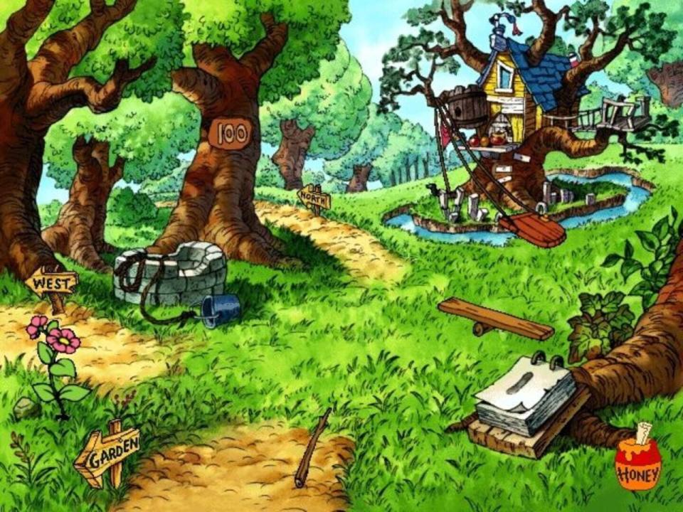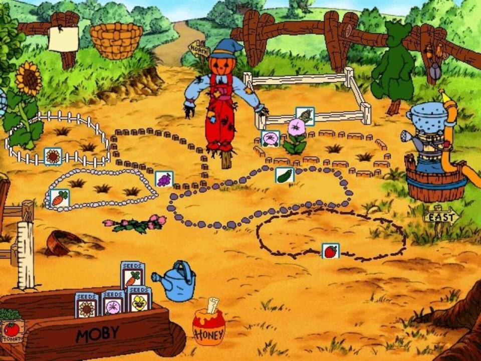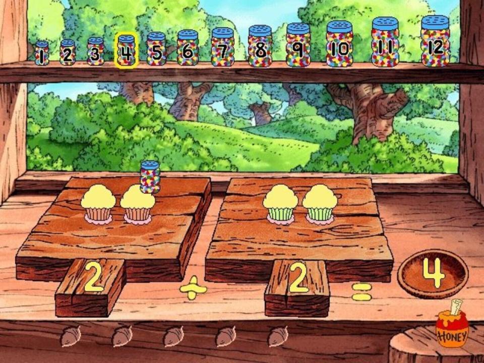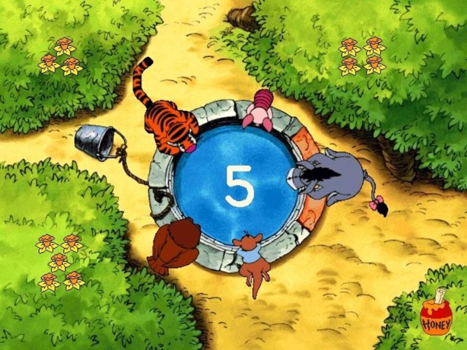 When Pooh floats down to land in the Hundred Acre Wood in Disney's Ready for Math With Pooh, he comes to earth in what will become a garden as the game progresses. The player signs in on a wheelbarrow and chooses a path from the three directions given - in each of these places he'll meet Pooh's friends; Piglet, Owl, Tigger, Eeyore, Roo, and Pooh himself, and play games designed to exercise his math skills at one of three levels. Gameplay is identical to that of the sister game Disney's Ready to Read with Pooh: pointing and clicking the mouse will perform actions, the cursor is a little bumblebee that flutters it's wings whenever it is over a hotspot, and when dragging an object is necessary the game utilizes click-and-stick.