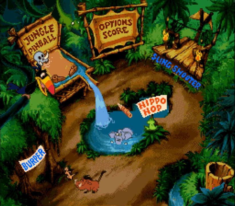 Timon and Pumbaa's Jungle Games consists of five mini-games featuring Timon and Pumbaa, as well as other jungle animals from The Lion King. The games are as follows: Jungle Pinball – a pinball game where the board is filled with animals instead of bumpers. Burper – a shooter type game, using Pumbaa to belch gas. Hippo Hop – concept similar to Frogger, as well as a game where Timon tries jumping across the river without falling in. Bug Drop – based on Puyo Puyo. Slingshooter – a slingshot game using berries to hit certain objects such as animals, cardboard targets, and bugs not counting Timon and Pumbaa as targets.