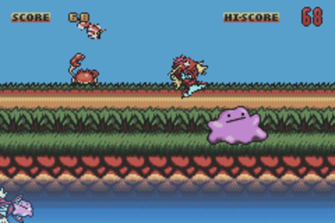 Ditto Leapfrog is a Pokemon e-Reader game for the Game Boy Advance. In order to play Ditto Leapfrog three different Pokémon e-Reader cards must be scanned. The cards required are: Ditto (#51), Granbull (#61), and Snubbull (#101). In Ditto Leapfrog a Kingler Pokémon will throw fish type Pokémon from the background to the foreground. The player must move Ditto (Who is in the foreground) left or right in order to make the fish Pokemon bounce off and into the water. Once three of the fish Pokemon have been missed the game will be over.