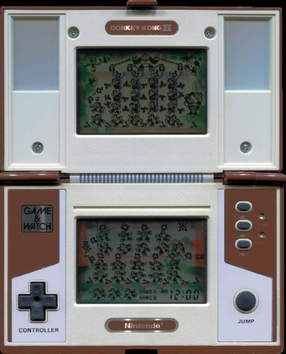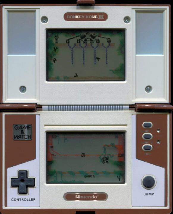 Donkey Kong II was developed by Nintendo R&D1 and released as part of the Game & Watch Multi Screen series, featuring two LCD screens. It was released in 1983. Donkey Kong Jr. has to touch a key, then it moves up to the top screen. Donkey Kong Jr. has to climb to the top screen while avoiding things such as electrical wires. When he gets to the top screen, Donkey Kong Jr. will have to touch the key again, and it will move to the keyhole of one of the chains. Donkey Kong Jr has to climb up the rope below the keyhole, while avoiding birds. When he gets to the top of the rope, one of the chains will unlock. He has to do this 4 times until he saves Donkey Kong. After that, the game will start over, at a somewhat faster pace.