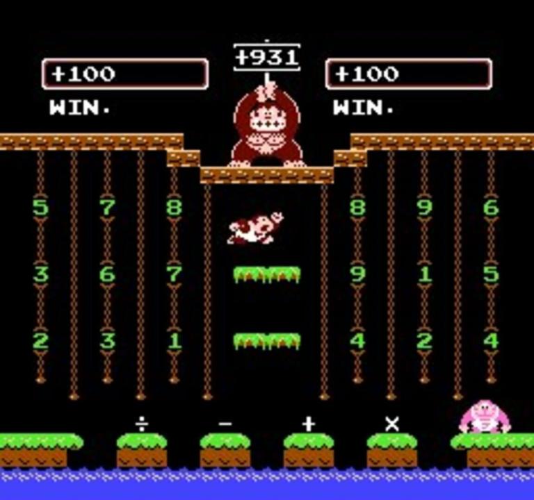 The game features one and two player modes, both of which are single screen. In the first mode, the objective is to enter math answers in order to receive points. These questions include addition, subtraction, multiplication, and division. In the two player mode, two players control two characters as they race to create a math formula to reach the number shown by Donkey Kong, incorporating platform gameplay. The mechanics are similar to Donkey Kong Junior; players climb vines to reach higher areas in order to collect numbers scattered around the area. In order to complete mathematics problems, players must collect at least three things: the first number, the symbol necessary to reach the number shown by Donkey Kong, and the second number. When the game features a high number, such as 66, players must collect multiple numbers and mathematics symbols in order to reach this. For example, players could choose a nine, a multiplication symbol, and a seven, followed by an addition symbol and a three to reach the number 66. The two player game have two different levels, Calculate A and Calculate B. Calculate B is more challanging, not only the goal is a negative number, but giving players the set number.