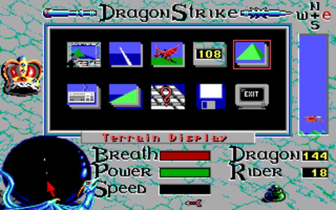DragonStrike is a flight simulator with some role-playing elements. The player character is a knight who flies on the back of a metallic dragon equipped with a lance and various magic items (among other things a magic orb that acts as a radar in the game).
