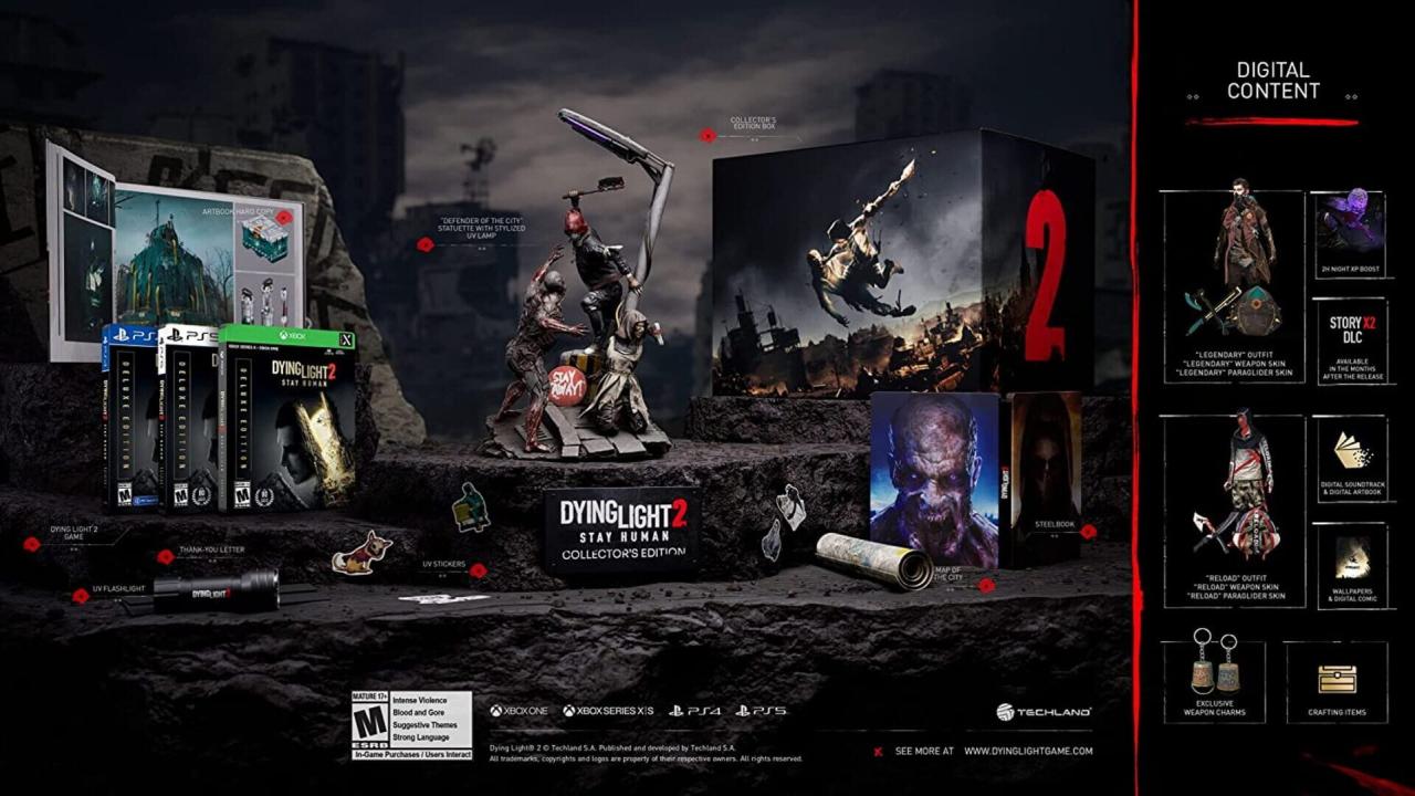 Dying Light 2: Stay Human - Collector's Edition includes: - Dying Light 2 Game - Exclusive Weapons Charms - Steelbook - Legendary Skin Pack (“Legendary” Outfit, “Legendary” Weapon Skin, “Legendary” Paraglider Skin) - Additional Story DLC 1 – Available post-launch - Additional Story DLC 2 – Available post-launch - Digital Soundtrack & Digital Artbook - Digital Wallpapers & Comic - 2h Night XP Boost & Crafting Items - “Defender of The City” statuette with stylized UV lamp - Artbook Hardcopy - Physical Map of the City - Physical UV Flashlight & UV stickers pack - Collector’s Edition Box