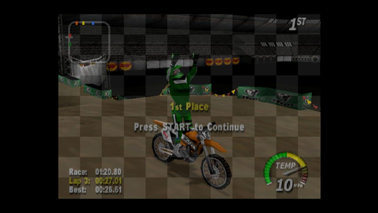 Experience extreme MX! You grind your way through the hairpin turn, a wall of mud exploding in your wake. Your next jump launches you into the air - you pull off a spectacular double no-footed can-can and become an instant legend! In Excitebike 64, you'll find all the high-flying action, heart-stopping stunts and bone-jarring crashes of the extreme sport of motocross. It'll set the daredevil inside you free. 20 stadium tracks and awesome outdoor courses - plus six different riders with six unique styles!
