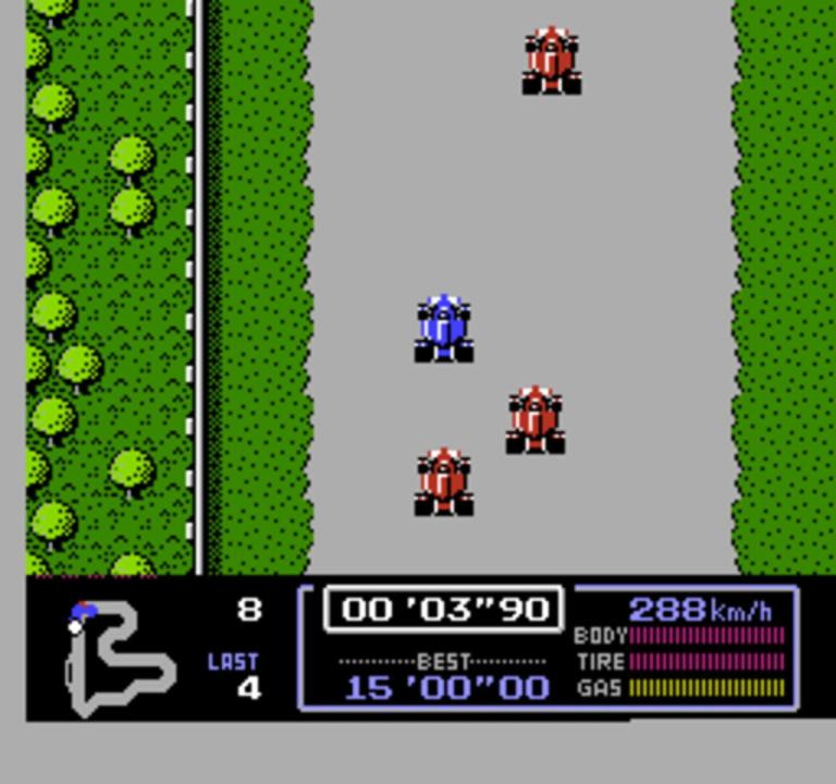 Famicom Grand Prix: F-1 Race is a Japan-exclusive racing game starring Mario in Formula One cars. In the game, players can choose to play alone or with other cars. Cars have a certain amount of health and fuel, which decreases whenever the player crashes into a wall or another car, as well as whenever he or she drives off of the road. This game, along with its sequel, was possibly an ancestor to the Mario Kart series, most likely due to the fact that it features Mario and possesses similar 2D racing mechanics, which was later carried on to Super Mario Kart.