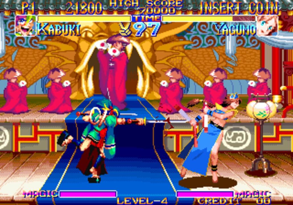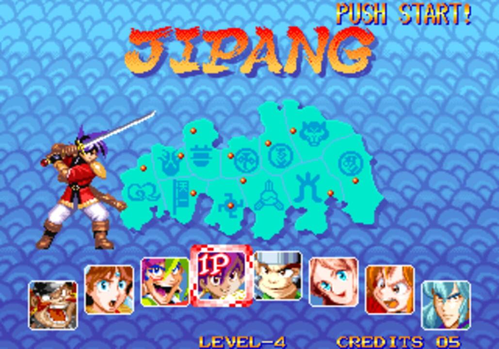 An arcade fighting game spin-off of a RPG series set in a fantasized feudal Japan. Known for its similarities with early Samurai Shodown games (including random item drops and combining attack buttons for heavier attacks), it is the only game in the entire series to get a release outside of Japan. The main series is composed of three separate games within the land of 'Jipang' (a fictionalized version of feudal Japan), each follows a descendant of the 'Fire Clan' and supporting cast in battles against a range of often comical villains. The stories of the games, though primarily of 'fantasy' fare, also attempt to provide commentary on common misconceptions about Japanese culture by western societies.