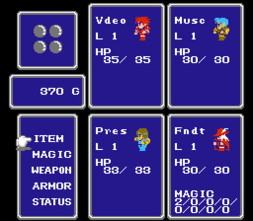 Final Fantasy, also known as FFI in re-releases, is the first role-playing game title in Square's flagship Final Fantasy series. The game puts players in control of four characters known as the Warriors of Light, and begins by asking the player to select the classes and names of each. The Warriors of Light can traverse the maps of dungeons and towns, which are connected by a world map, and will run into random encounters with enemies or fight bosses.