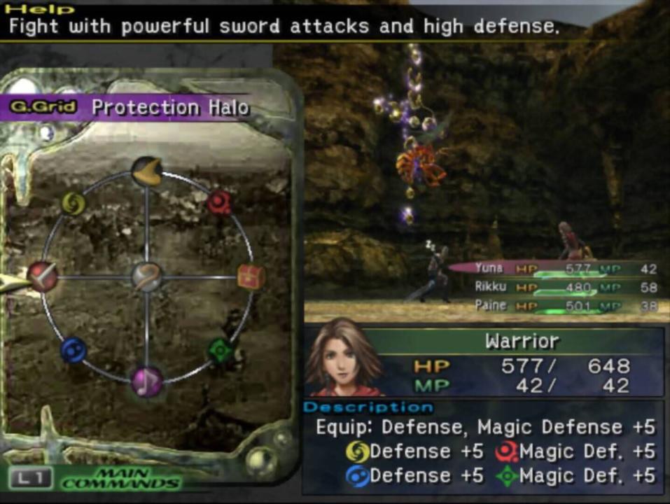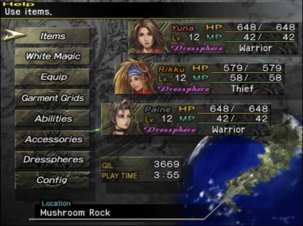 Final Fantasy X-2 is the direct sequel to Final Fantasy X, developed and published by Square Enix. It was the first direct sequel game in the Final Fantasy series and the first to feature an all-female playable cast. It also returned to the job system not seen in the main series since Final Fantasy V. The game uses a character class system where the equipped dressphere determines her abilities and stats. Party members can switch to any dressphere in their Garment Grid to swap to new skills and adapt to different opponents. It makes use of the Active Time Battle system that was absent from Final Fantasy X. The party has access to all locations early on and can visit them through the Celsius, complete several minigames and sidequests in a chapter before progressing through the story to the next one.