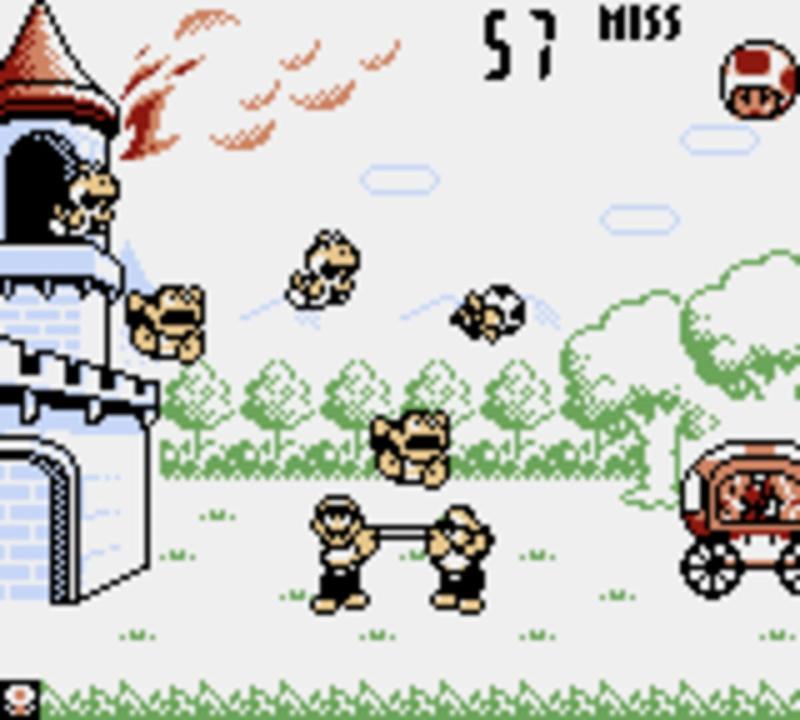 Mario and Luigi attempt to catch Toads, Yoshis, and Donkey Kong Jrs. after they jump out the window of Princess Peach's burning castle. The catch is that different characters fall at different speeds: Toads bounce the highest, while Donkey Kong Jrs. bounce the lowest. Yoshi Eggs also appear and contain either a Bob-omb or a Moon (a Super Star in the first game); the eggs break open when they are caught or hit the ground. The player receives two points for catching an egg. If a Bob-omb reaches the carriage, everyone, including the Mario Bros., runs away as the carriage explodes, and the player gets a miss. If the Mario Bros. catch a Moon, the player receives five points. At 200, 500, and 700 points, Peach appears and blows a kiss, sending out a heart for Mario or Luigi to catch to remove a miss. Music is also featured in this version, with the tempo changing depending on the speed of the game.