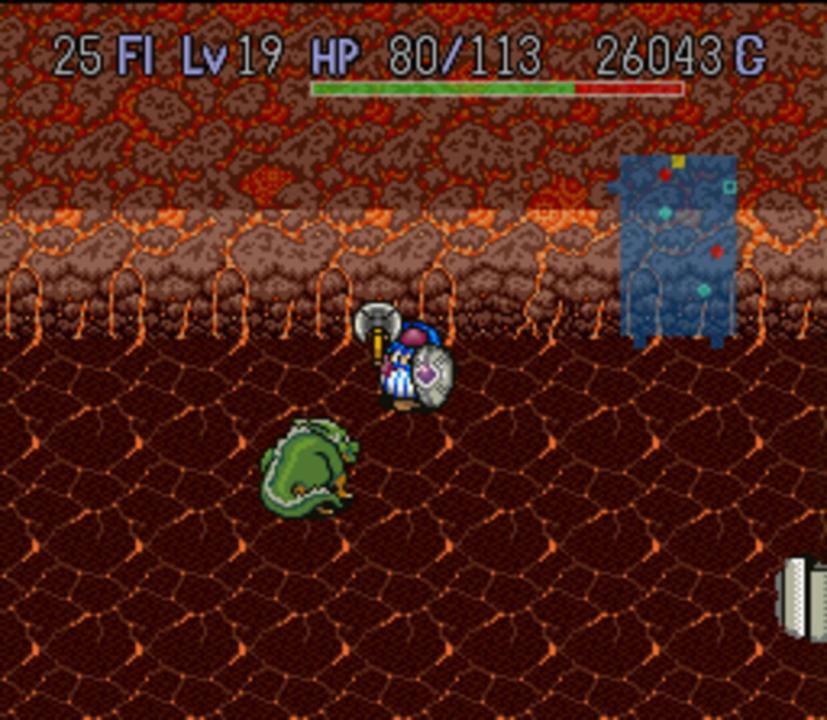 Torneko No Daibouken is a overhead view game similar to Hack, what might be called a "dungeon crawl". Torneko must venture into the mysterious dungeon gathering treasure. He may equip any weapons and shields he finds there, as well as gather up items such as spell scrolls, staffs and herbs with a variety of effect. A variety of enemies, familiar to the Dragon Quest series, await him. If Torneko successfully exits the dungeon, he is able to sell any of the items he has collected. This money then goes to improve the quality of his shop and living quarters. As the game progresses, Torneko is able to store special items in the vault, which he is then able to bring with him on subsequent trips to the dungeon.