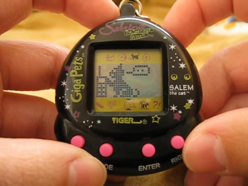 Giga Pets are digital pet toys. Available in a variety of different characters, each Giga Pet is a palm-sized unit with an LCD screen and attached key ring. To ensure a happy, healthy pet, its owner has to take care of it similar to how one might care for a real animal, including feeding, cleaning, and playing with their Giga Pet.