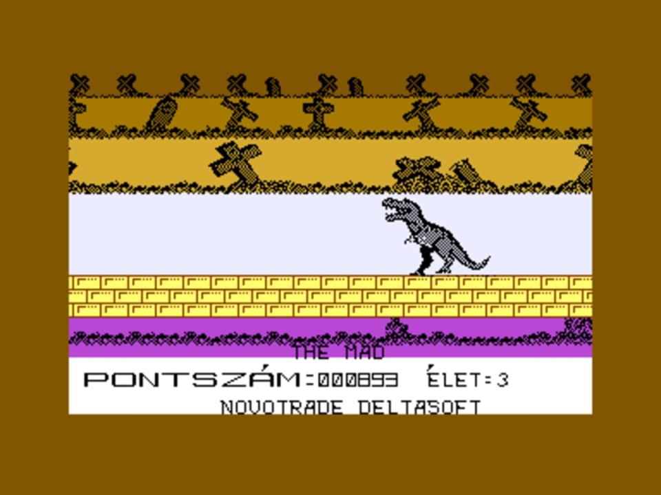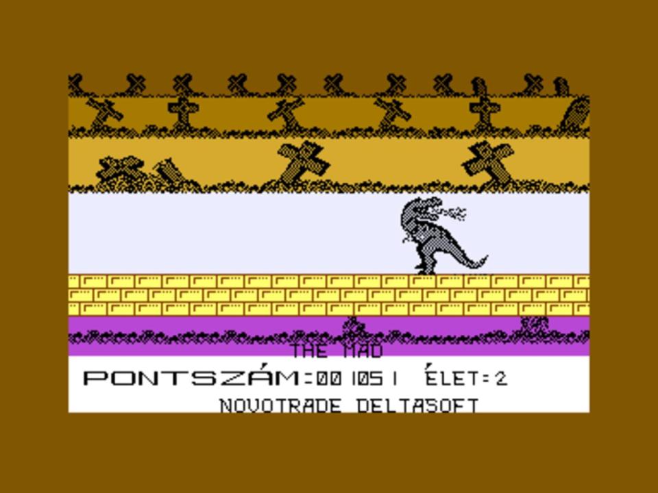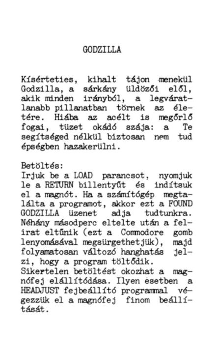Godzilla is a 1988 action video game for the Commodore 16 and Commodore Plus/4 developed by Attila Cosir and distributed by Novotrade and then re-released by DELTASoft. It is a simple, endless game of avoiding taking hits from obstacles and enemies in a scrolling field. The first level introduces ground spikes, which can be jumped over. The second level introduces a UFO-like object that flies toward Godzilla's head, which can be eaten. The third level introduces a giant bee that heads toward the back of Godzilla's head, and is defeated by using fire breath. Finally, the fourth level introduces a space shuttle-like object that cruises on the ground, which can be jumped over. Godzilla has 6 lives, and once they're gone the player has to start over. The game awards points for keeping Godzilla alive, however it doesn't keep track of high scores. The game itself is completely silent, save for a brief voice sample when the game is started, and a loud, static-filled roar that Godzilla utters whenever he gets hit by an object.