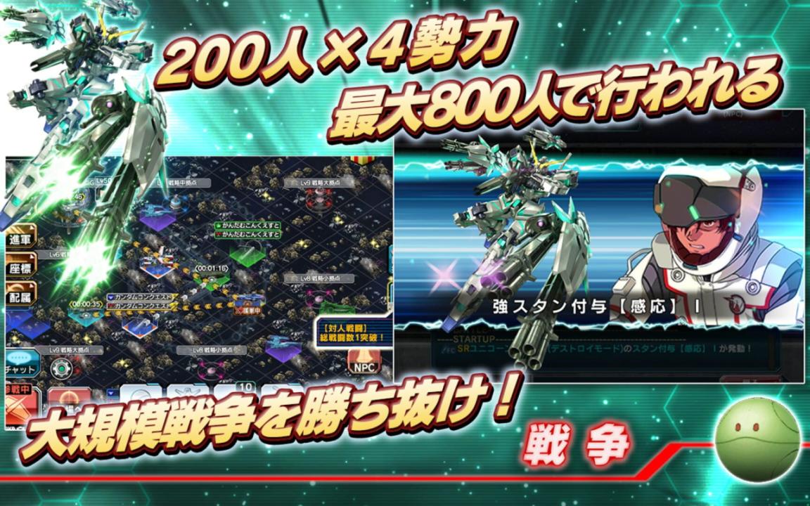 The powerful collaboration between the nationally beloved robot anime "Mobile Suit Gundam" and the popular smartphone game "Kingdom Conquest," which has achieved over 5 million downloads (※), has finally come to fruition! This is an online-only game where you can play with tens of thousands of players! Players can play both the simulation part, where you develop colonies and wage war, and the action part, where up to four players can cooperate. Strengthen your forces and aim for victory! The mobile versions were delisted after mid 2017. The versions' service was ended on October 29, 2018. There is a PS Vita port.