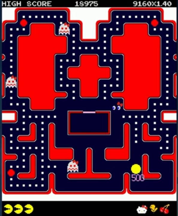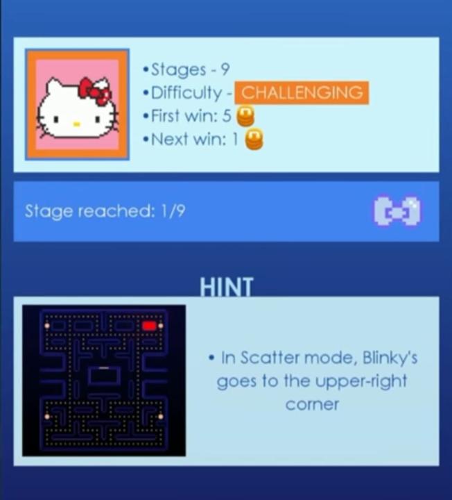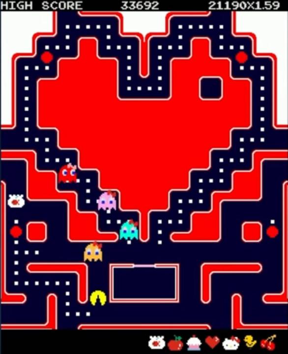 The Hello Kitty ♥ Pac-Man video game was first released in 2017 as limited-time event for Pac-Man + Tournaments. It was later republished in 2020 as part of the World's Smallest Tiny Arcade line by Super Impulse. These are the features found in the Hello Kitty game that differ from the original arcade: All mazes have been changed in unique shapes and colors, such as one resembling a rubber duck. The ghosts have white bows on their heads. Some levels only feature three ghosts instead of four. The giant Pac-Man in the first intermission is replaced with Hello Kitty; this is the only time she actually appears in-game.