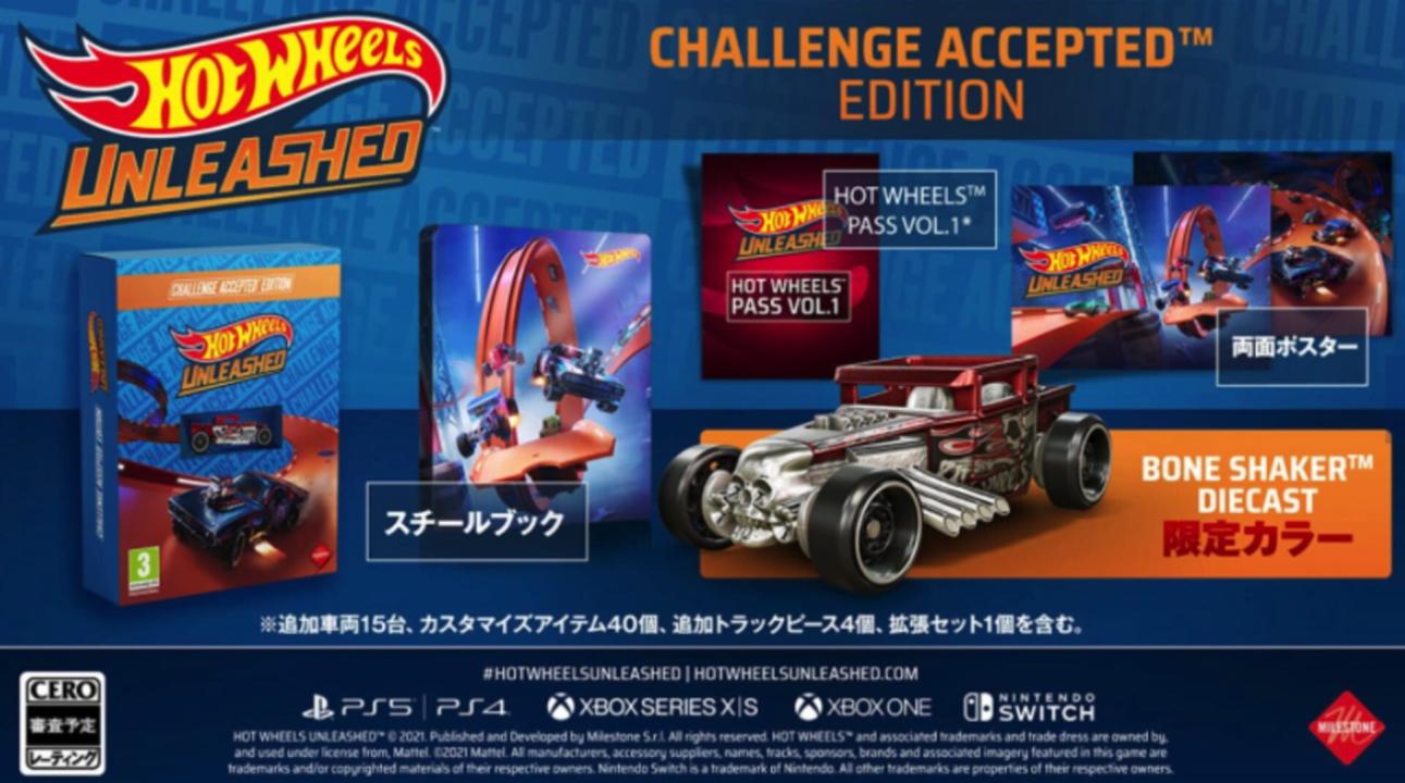 Build your collection! The very best of the Hot Wheels universe is here! Get behind the wheel of the coolest, fastest, and most legendary vehicles, with their own personality, driving style, and levels of rarity. Discover all their unique attributes and how to use them to face every track and challenge. And with the Livery Editor make your ride a one-of-a-kind masterpiece of speed! The Challenge Accepted Edition includes: - Game: Hot Wheels Unleashed - Hot Wheels Pass Vol. 1 - 2 Sided Poster - Steelbook Case - Bone Shaker Diecast