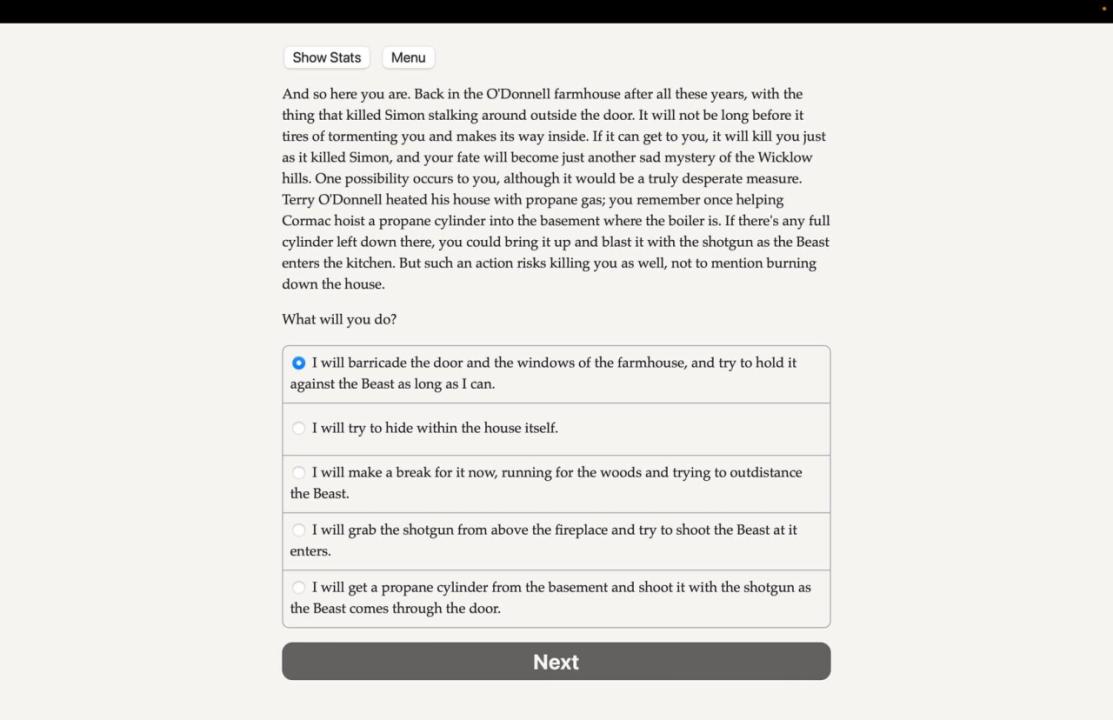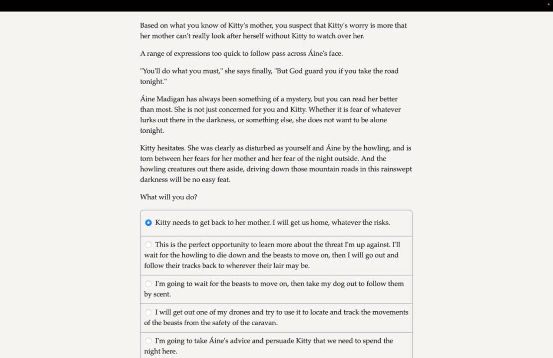 Full moon. Cold night. Dark shadow. Warm gun. The Beast of Glenkildove has stalked Ireland for centuries. Now, you must hunt it. A text-based interactive novel set in the World of Darkness.
