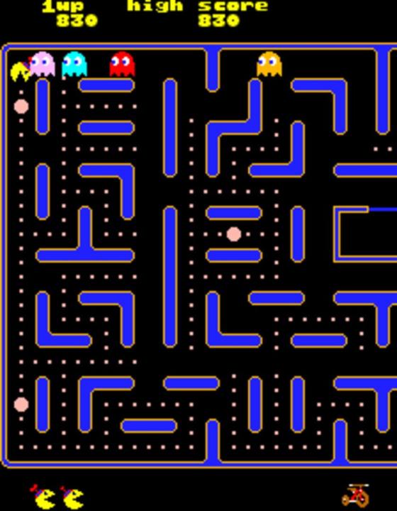 The gameplay of Jr. Pac-Man is similar to that of its predecessors: The player controls the titular Jr. Pac-Man and scores points by eating all of the dots in the maze. Four ghosts roam the maze and attempt to capture him. The player can eat an energizer to turn the ghosts blue, making them vulnerable for a short time and allowing the player to eat them, sending their eyes back to their home base. When all the dots are cleared, a new maze is presented and gameplay resumes.
