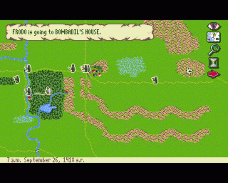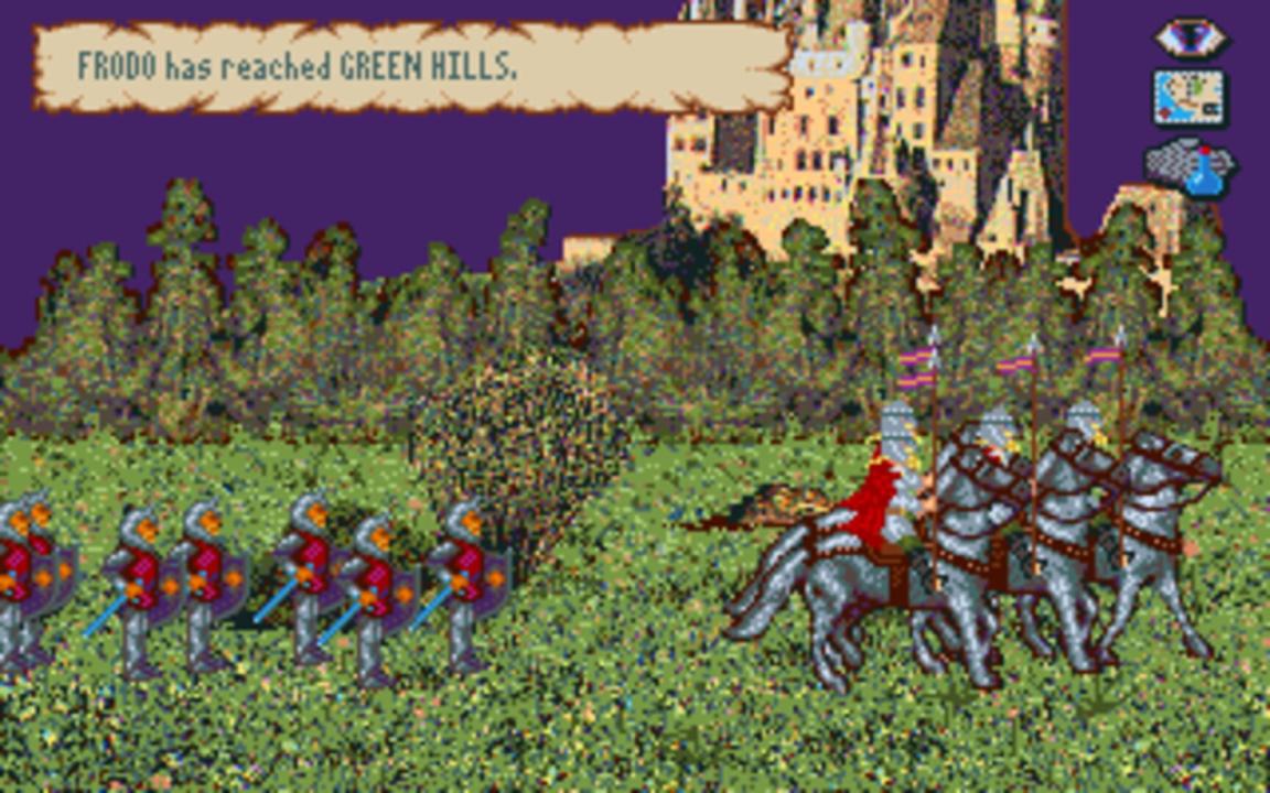 J.R.R. Tolkien's War in Middle Earth is the 16-bit game with additional adventuring features compared to the 8-bit version, loosely depicting the events of the One Ring from the Shire to Mt. Doom. The game starts with the three hobbits: Frodo, Sam, and Pippin surrounded by nine individual units of Nazgul near the Shire. Although the first task is to travel to Rivendell, the player is free to decide how heroes and armies progress, despite the in-game conventional storyline.