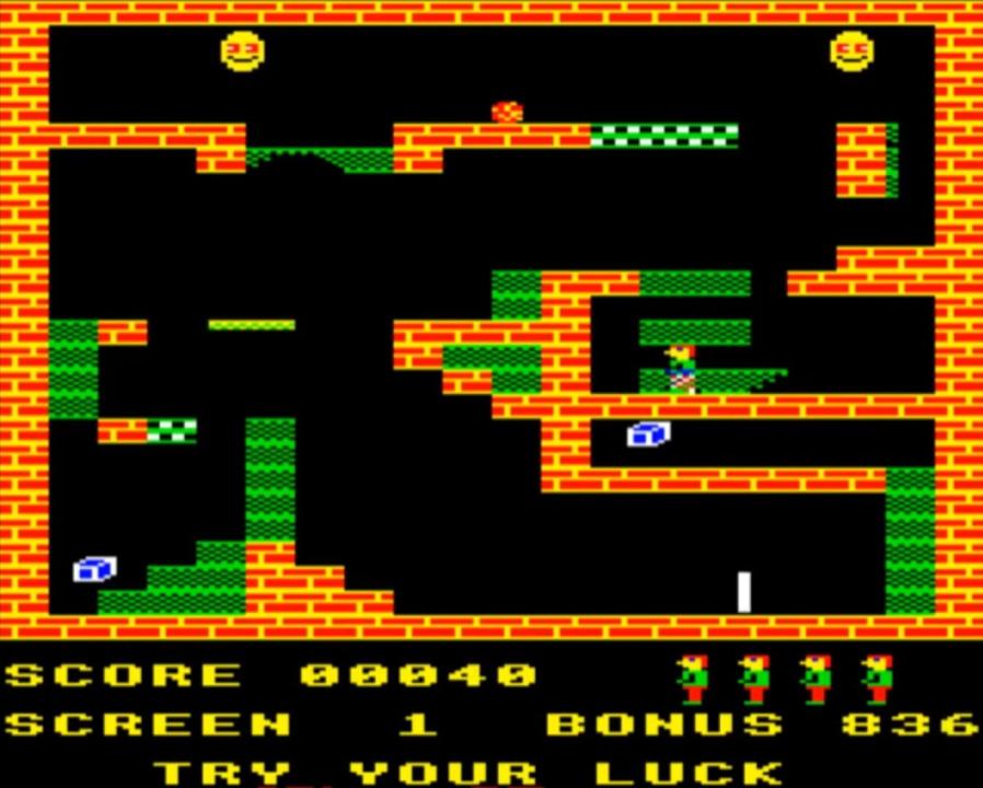 Karls Kavern is a platformer in the style of Manic Miner. It consists of thirty single screen levels where the objective in each is to simply collect all the boxes that lies scattered around. To make it the player has to jump between platforms (including moving ones) and avoid getting touched by any of the dangers that exist in the underground. Any contact will lead to a loss of life and so will a long fall. Part of the levels are also collapsing platforms and conveyor belts. The player has five lives and when they are all used up the game ends.