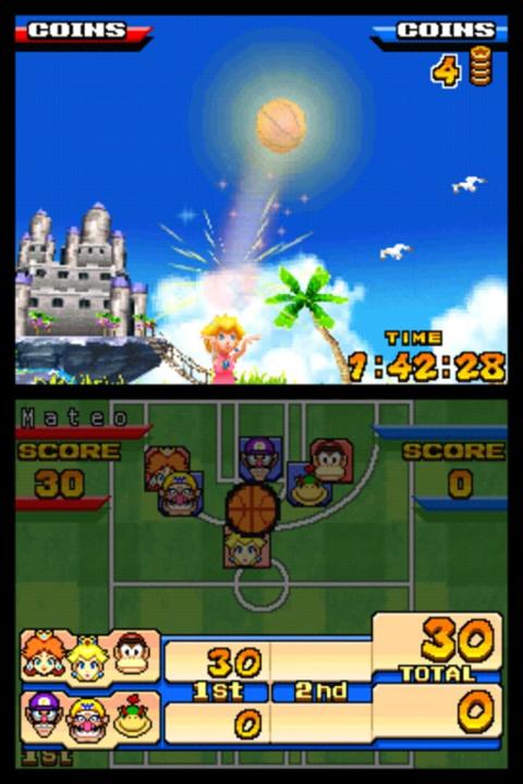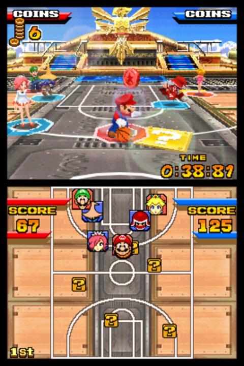 Get that magic touch. There are plenty of basketball games out there, but none with the hands-on control of Mario Hoops 3-on-3. Players use the touch screen to get their game on as they execute tricky dribbles, special passes and sweet shots - all with strokes and taps of the stylus. Players choose their teams of three characters from the Mario universe and hit the parquet. Power-ups like Red Shells and Bob-ombs can turn the tide as they chase down coins - they will affect the score, so players collect as many as they can as they drive to the hoop. Whether playing against friends on a local wireless connection, jamming through a tournament or just playing mini-games, there's a mode for everyone.