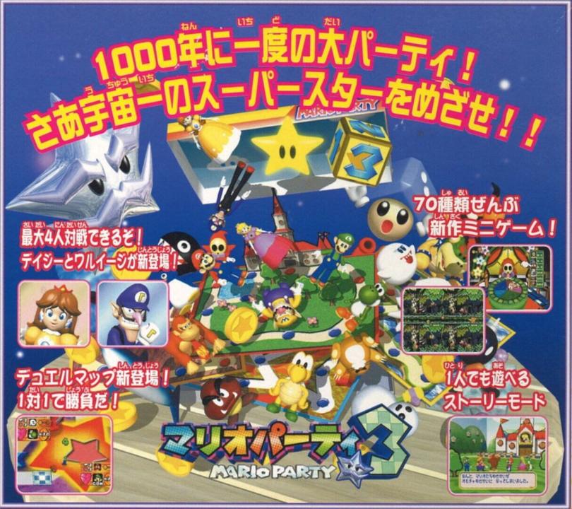 Mario Party 3 is the third and final Mario Party title for the Nintendo 64. A total of eight characters are available to choose from: Mario, Luigi, Princess Peach, Yoshi, Wario, Donkey Kong, and newcomers Waluigi and Princess Daisy. Mario Party 3 features duel maps, in which two players try to lower each other's stamina to zero using non-playable characters such as Chain Chomps. It is the first Mario Party game to feature Luigi's main voice and also it is last Mario game where Princess Daisy appears in a yellow and white dress, and with long hair, as well as the last Mario game (until New Super Mario Bros. Wii) in which Yoshi's "record-scratching" voice is used. It is also the first Mario Party game to have multiple save slots.