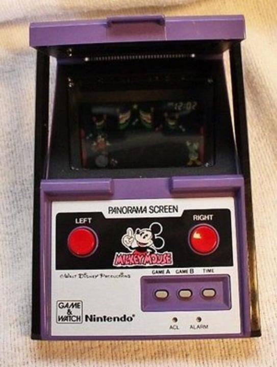 There are two Game & Watch games called Mickey Mouse. In this one, which is part of the Panorama series, Mickey has to juggle while balancing on top of a ball. Mickey can lose a life by catching a fire stick instead of a juggling stick or missing catching the juggling stick completely.