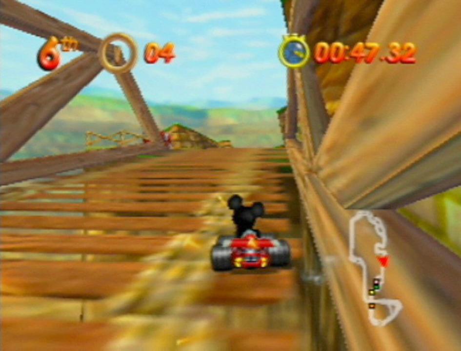 Buckle up and get ready to race! Rally across America with Mickey and friends! Race around 20 All-American courses - from Alaska to the Everglades - as you try to track down the Weasels and rescue poor dognapped Pluto. Use Ludwig Von Drake's wacky weapons - such as the "Antigrav-o-Kit Magno Flyer" or the "Stormy Weather Whenever Engager" - to give you the edge. Then blast past your friends and listen as the drivers taunt each other using Disney's original character voices!