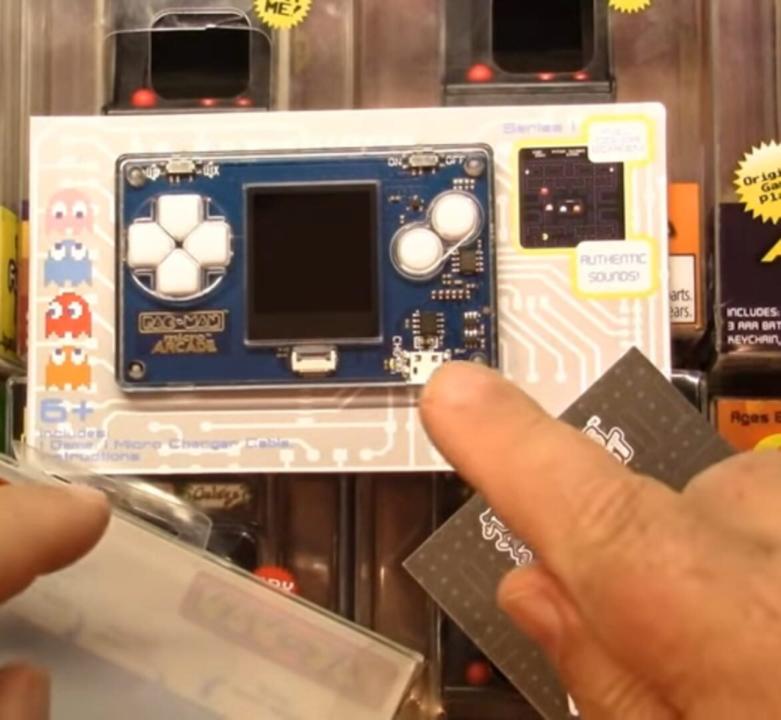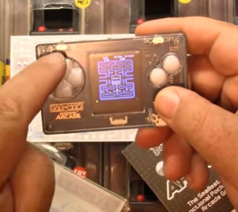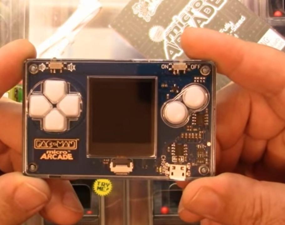 A full-size Pac-Man arcade game in a credit card size. The game comes with a full color screen, sound effects, and directional control buttons, with a micro USB charger included.