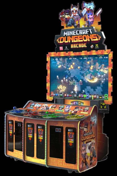 Minecraft Dungeons Arcade is a 1-4 player co-op arcade machine adaptation of the Minecraft Dungeons game. For each paid play, the game issues a reusable physical card that can be scanned at the arcade machine for equipment and power-ups.
