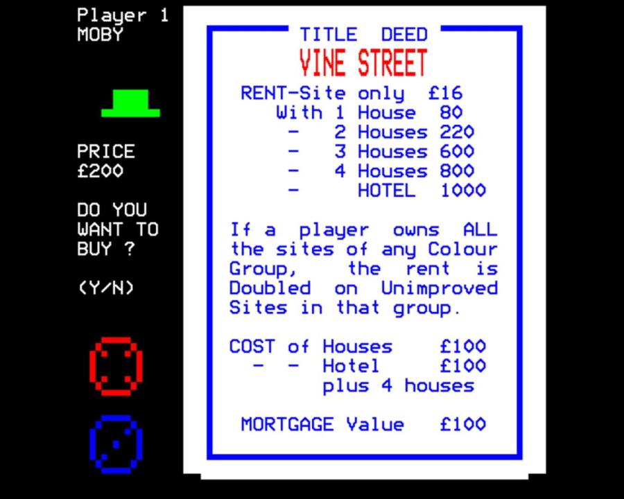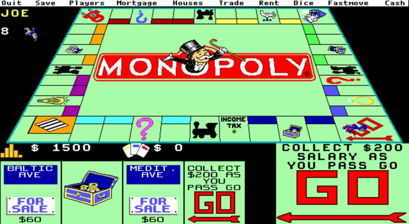 This version of the classic board game supports several graphic formats and offers some different options. From 2 to 8 players can play the game, and they can all be computer players if you wish. This allows you to just sit back and watch as the computer takes over. You can choose to play a short game with a specified time limit, or a standard game, and there is a save game feature. All actions are handled entirely by keyboard. Questions appear in the center area of the board (for buying property, for instance). Pressing the first letter of a word from the top bar takes that action (Q for Quit as an example). Player stats can be viewed on the screen.