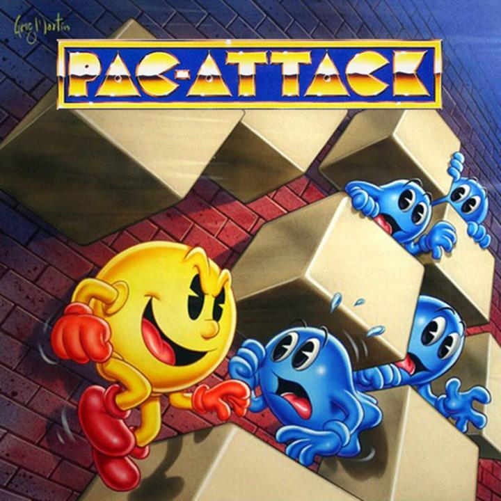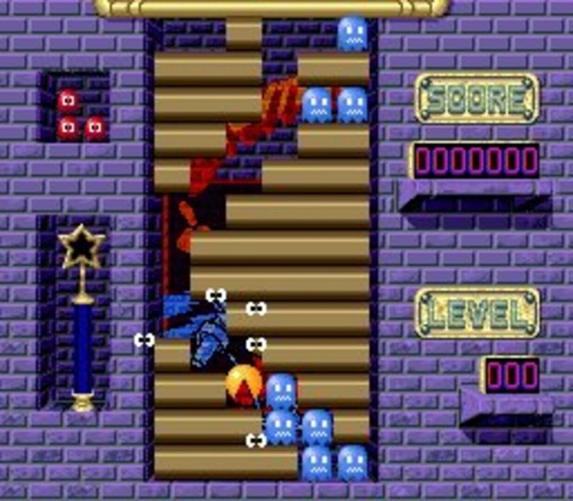 Based on Namco's Japanese-only arcade puzzler Cosmo Gang the Puzzle, Pac-Attack is similar to many block-dropping puzzle games from the time, such as Puyo Puyo. The objective of the game is to place ghosts and blocks that are arranged in a three part L-shaped piece, so that Pac-Man, after three or more pieces (who replaces one of the parts), can eat as many ghosts as possible to try and clear up the game area. Pac-Man's directions are chosen at random between left or right, but as he goes moving on in the game area (after you place him, of course), if he bumps against a block or the "walls" of the game area, he will change his direction. As Pac-Man eats ghosts and clear rows of blocks, the level increases, which affects the speed and gravity of the pieces one places, as well as the amount of pieces placed before Pac-Man will appear. If one is unable to fit the bottom two parts of a piece into a legal zone of the playing area, the game ends. However, by filling up a meter on the left of the screen via eating ghosts, a fairy will be summoned in place of Pac-Man. She can fit into any empty space, and can clear up to 7 rows of ghosts; all blocks that were on top of cleared ghosts will drop down accordingly. The game also includes a Puzzle mode. It features 100 levels, in which you have to eat all ghosts with no more than 4 Pac-Men at least (the number reduces in certain levels), and, unlike the other modes, you can change Pac-Man's direction with the press of a button.
