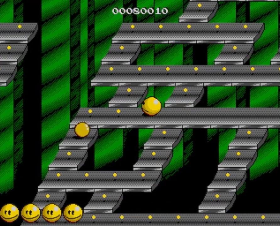 Pac-Mania is a variation on the game Pac-Man. You need to guide Pac-Man around a maze and eat all of the dots on the board to proceed on to the next round. Numerous, multi-colored ghosts also roam the maze trying to stop you. If you eat one of the power pellets in the maze, the ghosts will temporarily turn blue and run from you. Pac-Man can earn bonus points by eating the ghosts when they are in this state. The maze is now shown in isometric perspective and is larger than the screen which will scroll to follow the action. To help get out of tight spots, Pac-Man can now jump. But be careful, because some of the ghosts have learned this trick as well and you could end up in a mid-air collision!